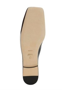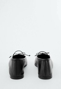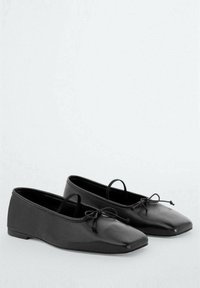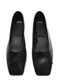 Ballerines en cuir noir avec un bout étroit et pointu, ornées d'un nœud décoratif à l'avant. Elles possèdent une semelle plate et un design minimaliste.