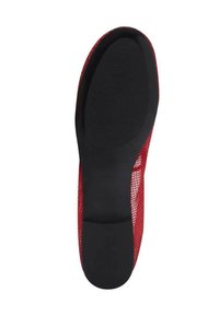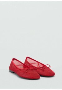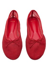 Ballerines en maille rouge avec un bout pointu, un petit nœud sur le dessus, un petit talon noir et une bordure lisse le long de l'ouverture.