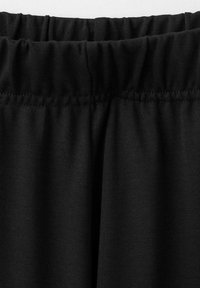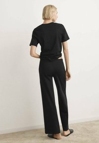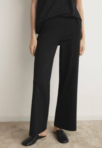 Femme blonde en haut noir à manches courtes et col en V, portant un pantalon noir à jambes larges, pieds nus sur un tapis contre un mur blanc.
