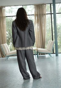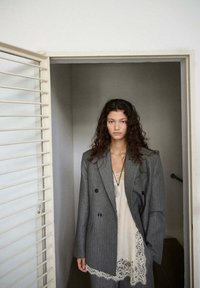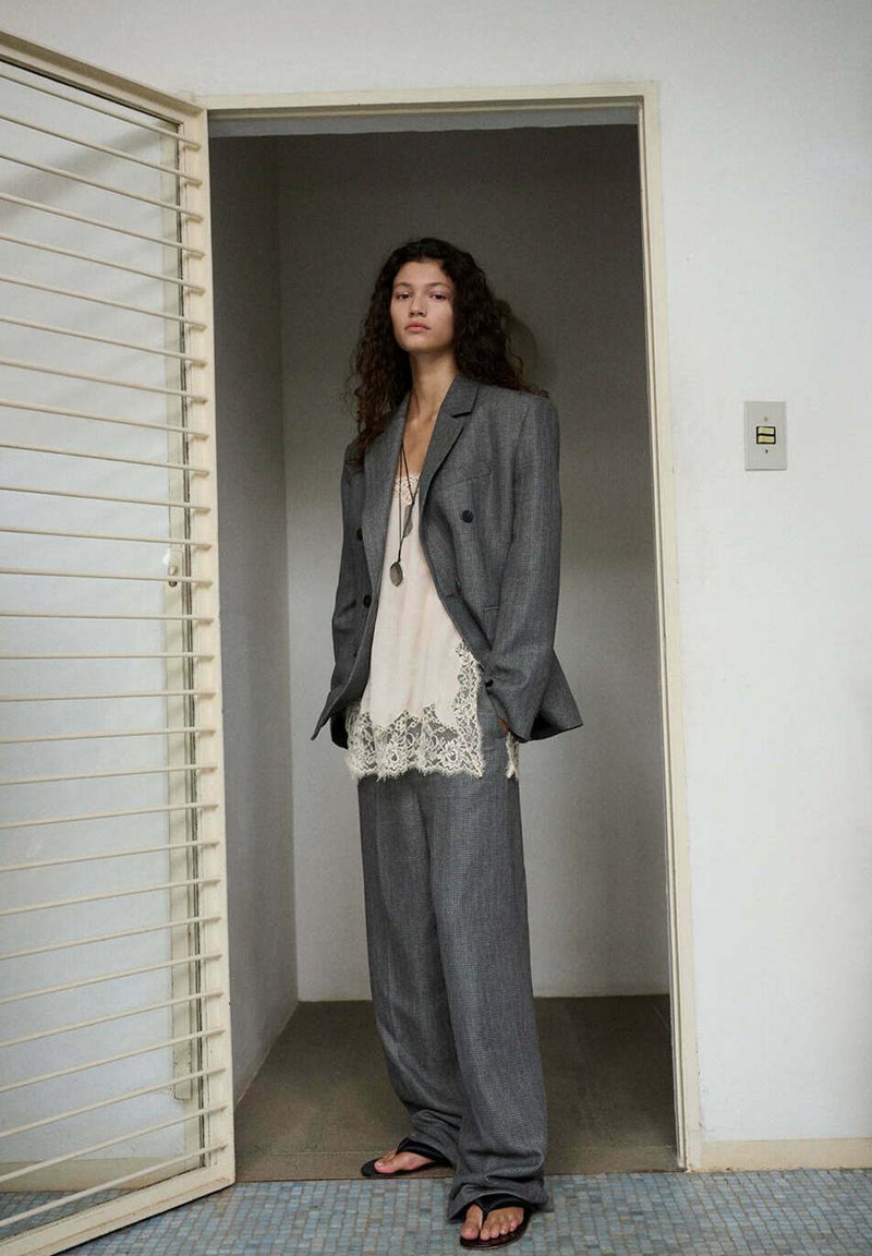 Femme aux cheveux bouclés debout dans l'embrasure de la porte, portant un costume gris oversize, un top en dentelle crème, des tongs noires et un long collier pendentif.