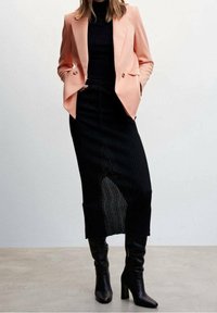 Femme portant un blazer rose pâle à double boutonnage sur un col roulé noir et une jupe, avec deux boutons écaille de tortue et des poches à rabat.