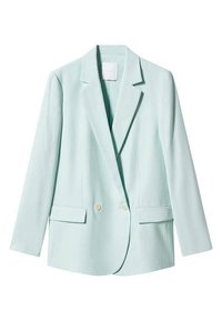 Personne portant un blazer croisé vert menthe clair à manches retroussées et un pantalon assorti, sur un fond uni.