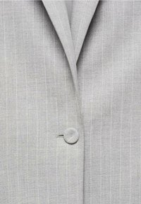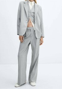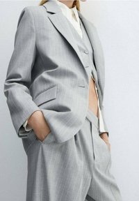 Femme portant un costume gris clair à fines rayures composé d'un blazer, d'un gilet et d'un pantalon, chemise blanche boutonnée partiellement rentrée, main dans la poche.