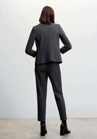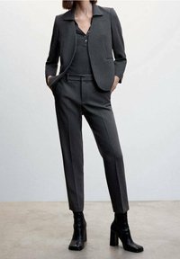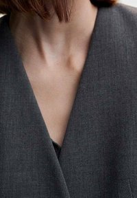 Femme portant un blazer gris foncé ajusté et un pantalon assorti, tenant le blazer fermé d'une main.