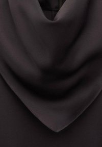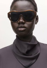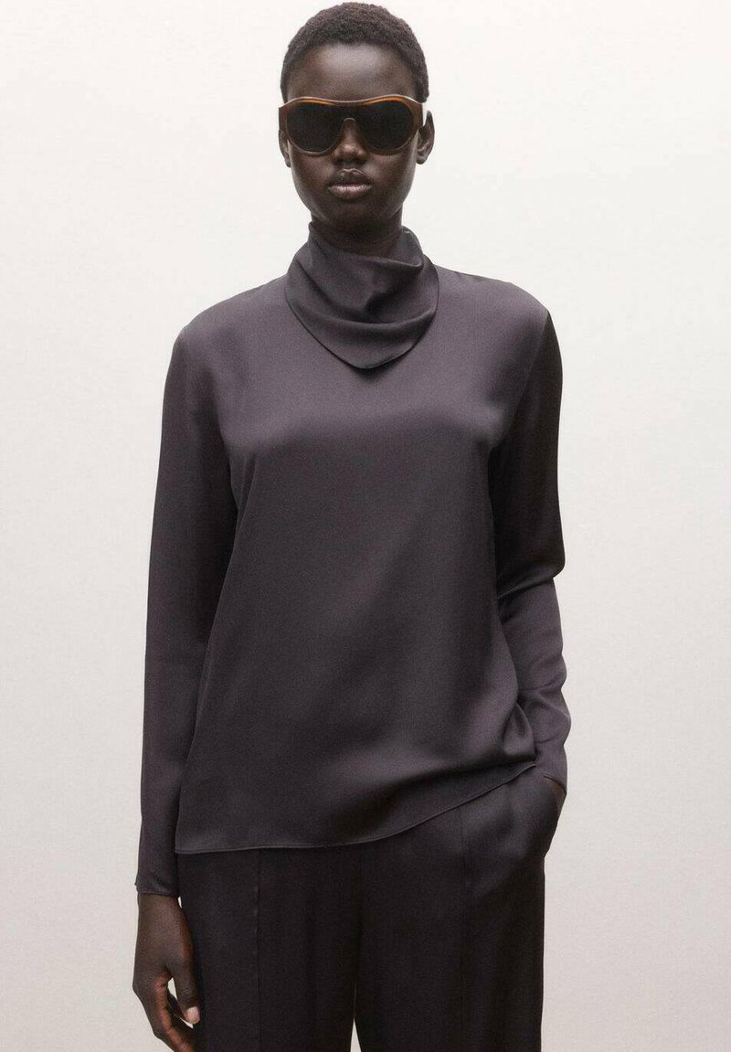 Personne portant de grandes lunettes de soleil foncées, un chemisier à manches longues sombre à col montant, et un pantalon sombre assorti, debout devant un fond uni.
