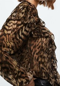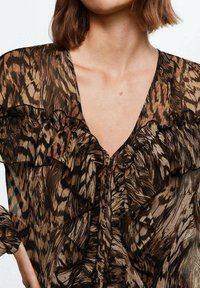 Femme portant un chemisier en mousseline marron à volants et motifs, une mini-jupe en cuir noir et des escarpins noirs à bride cheville, debout les mains sur les hanches.