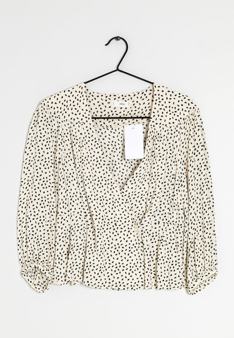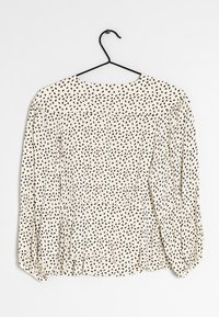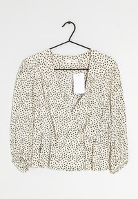 Blouse de couleur claire avec des taches noires, devant plissé et manches bouffantes. Présente un décolleté en V profond et une étiquette attachée à l'encolure.