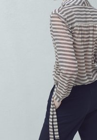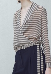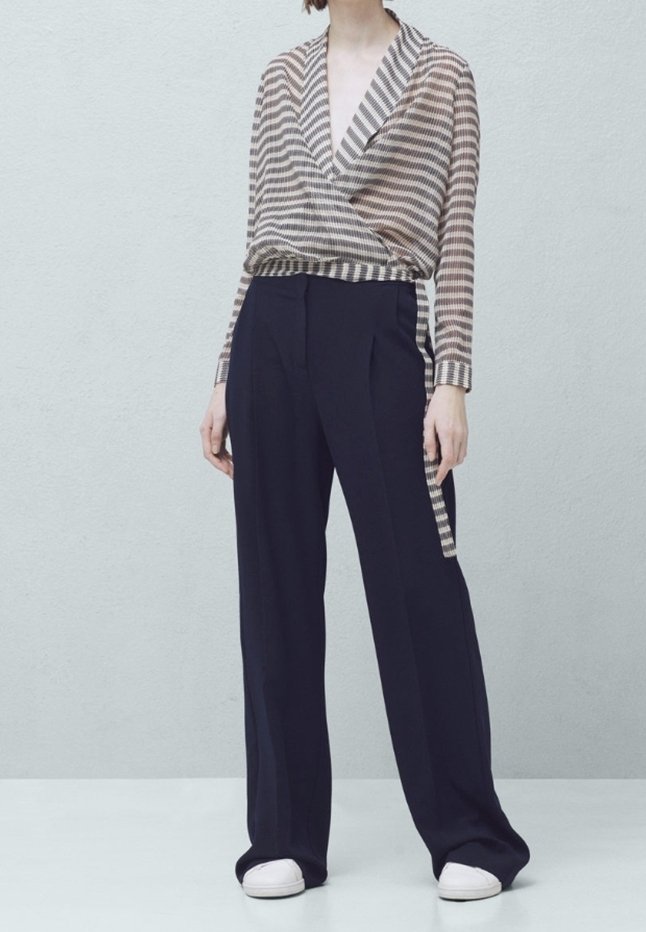 Personne portant un chemisier cache-cœur rayé marron et beige, un pantalon large taille haute bleu marine avec une bande latérale, et des baskets blanches, debout contre un mur gris.