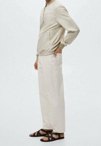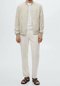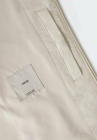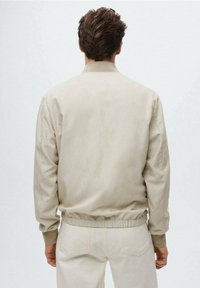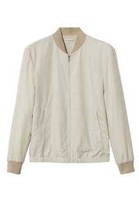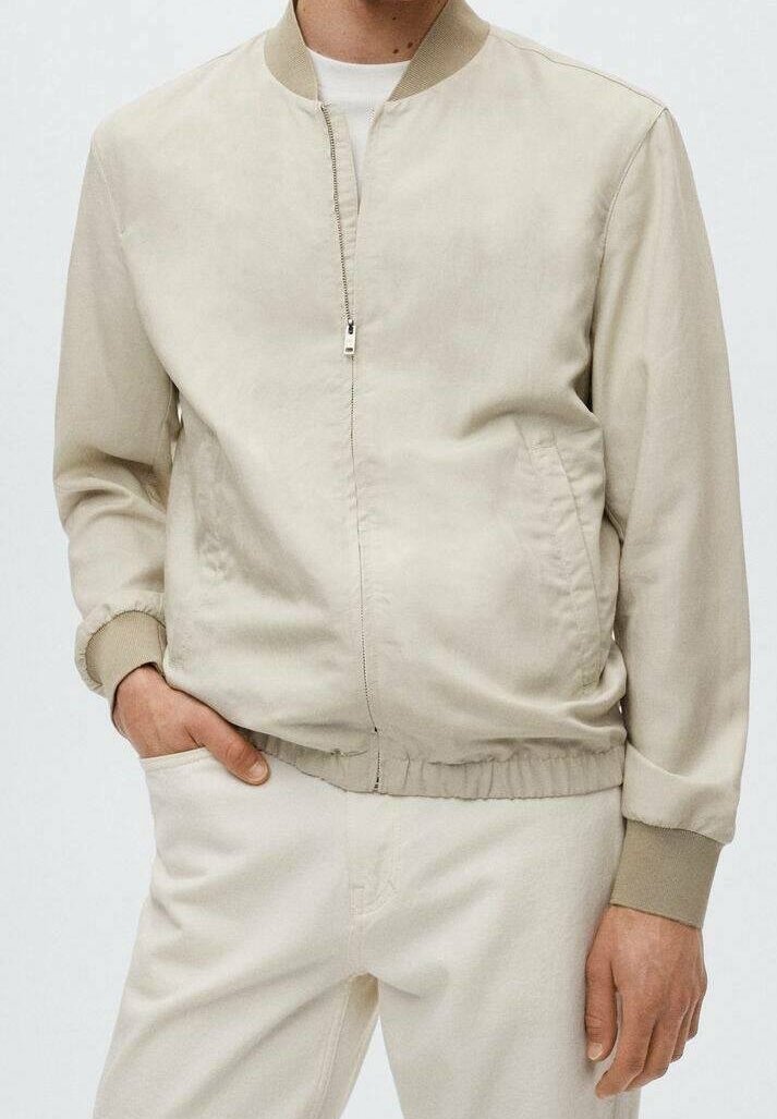 Blouson aviateur beige en tissu lisse avec poignets et col côtelés ; comprend une fermeture éclair et des poches latérales ; coupe décontractée avec ourlet élastique.
