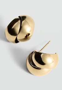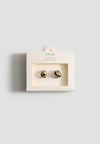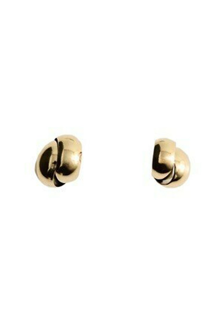 Deux petites boucle d'oreille en or poli avec un design tordu ressemblant à un nœud sur fond blanc.