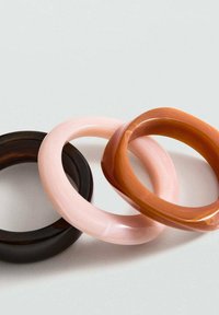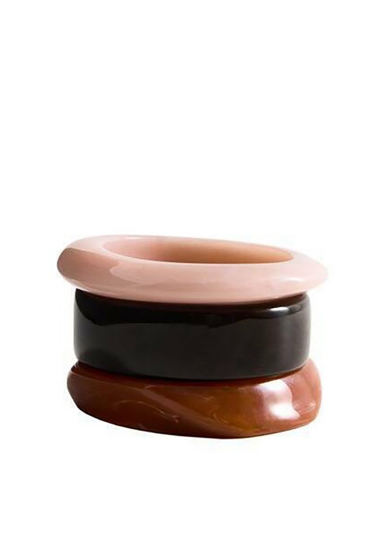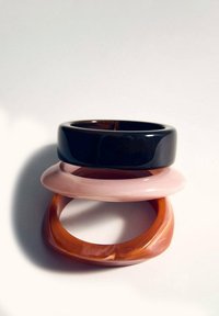 Trois bracelets lisses et brillants empilés, en rose clair, noir et marron marbré, sur un fond blanc.