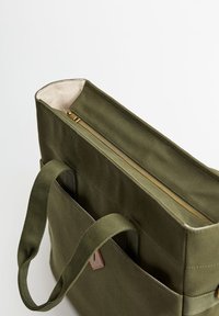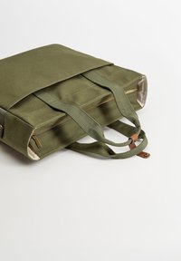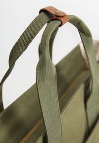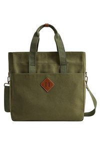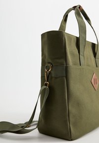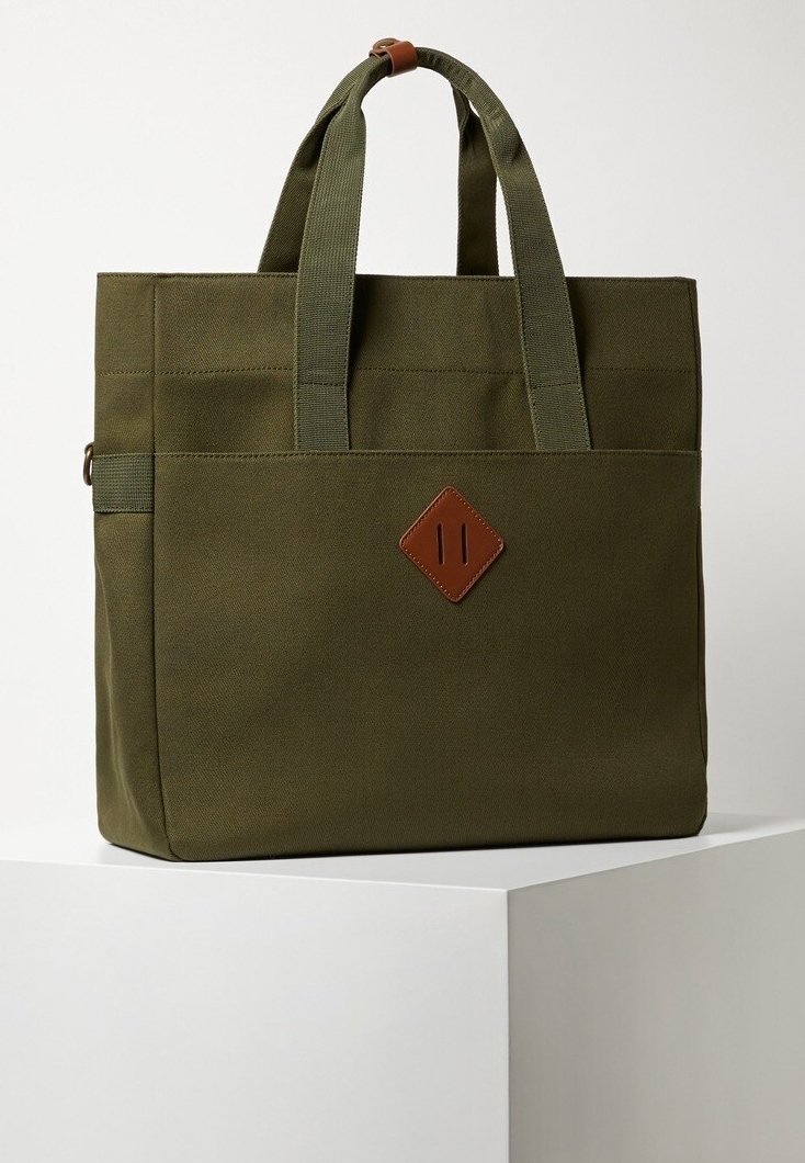 Sac fourre-tout en toile vert olive avec doubles poignées supérieures, une poche avant et un patch en cuir marron en forme de losange à l'avant.