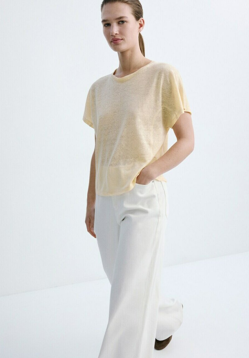 Femme aux cheveux attachés, portant un haut ample à manches courtes de couleur jaune pâle et un pantalon blanc à jambes larges, debout avec une main dans la poche.