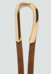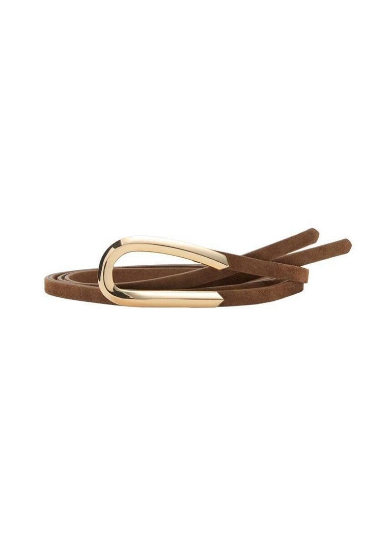 Ceinture fine en daim marron avec une boucle courbée en métal doré, présentée enroulée sur un fond blanc.