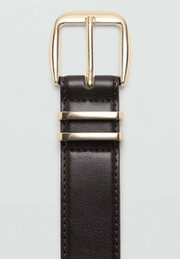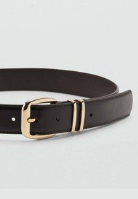 Ceinture en cuir noir avec une boucle en métal doré à deux pattes, texture lisse et couture nette le long des bords.