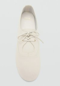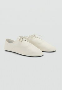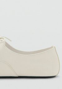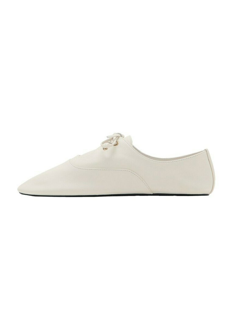 Chaussure plate blanche en cuir minimaliste à bout pointu, lacets à l'avant et semelle noire vue de profil sur fond blanc.