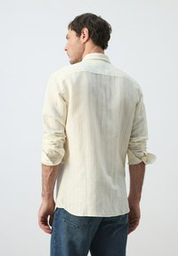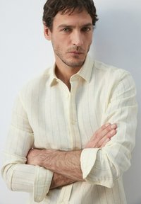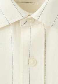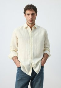 Homme aux cheveux courts et foncés portant une chemise crème à boutons avec de fines rayures et un jean bleu, debout les mains dans les poches.