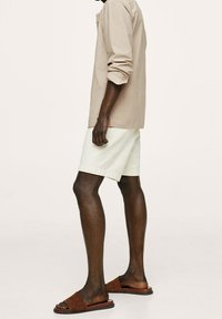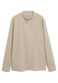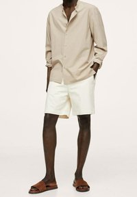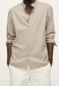 Homme portant une chemise beige à col mandarin boutonnée, manches retroussées, associée à un pantalon blanc, mains dans les poches.