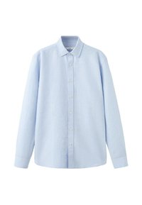 Homme portant une chemise bleu à boutons avec des fines rayures blanches et un jean bleu clair, debout devant un fond blanc uni.