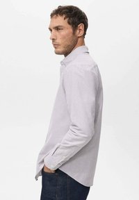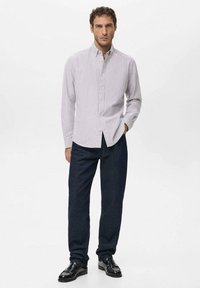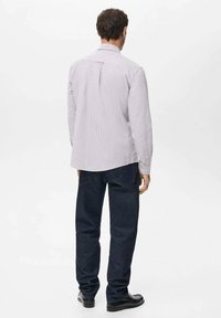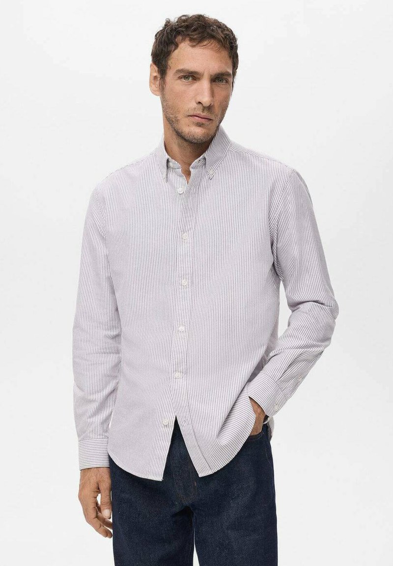 Chemise pour homme à boutons, de couleur violet clair avec des rayures verticales blanches, dotée d'un col classique, de manches longues et d'une coupe droite.
