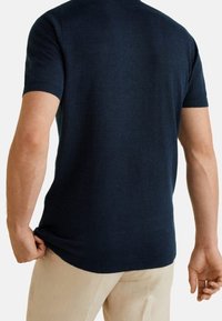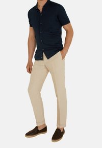 Homme portant un polo à manches courtes bleu marine avec boutons et un pantalon beige clair, debout devant un fond uni.