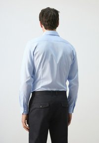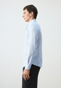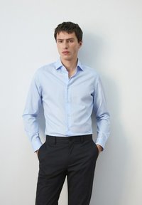 Jeune homme debout, mains dans les poches, portant une chemise à rayures bleu clair boutonnée et un pantalon foncé, sur un fond uni.