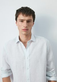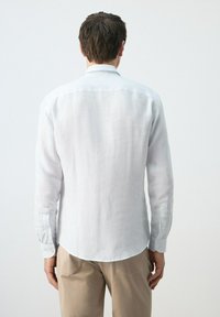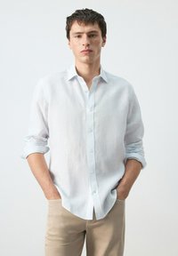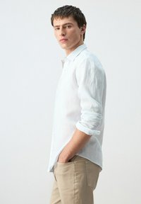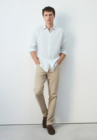 Jeune homme aux cheveux courts et foncés, portant une chemise blanche à boutons aux manches retroussées et un pantalon beige, les mains dans les poches, fond neutre.