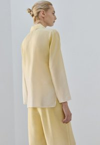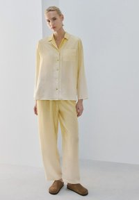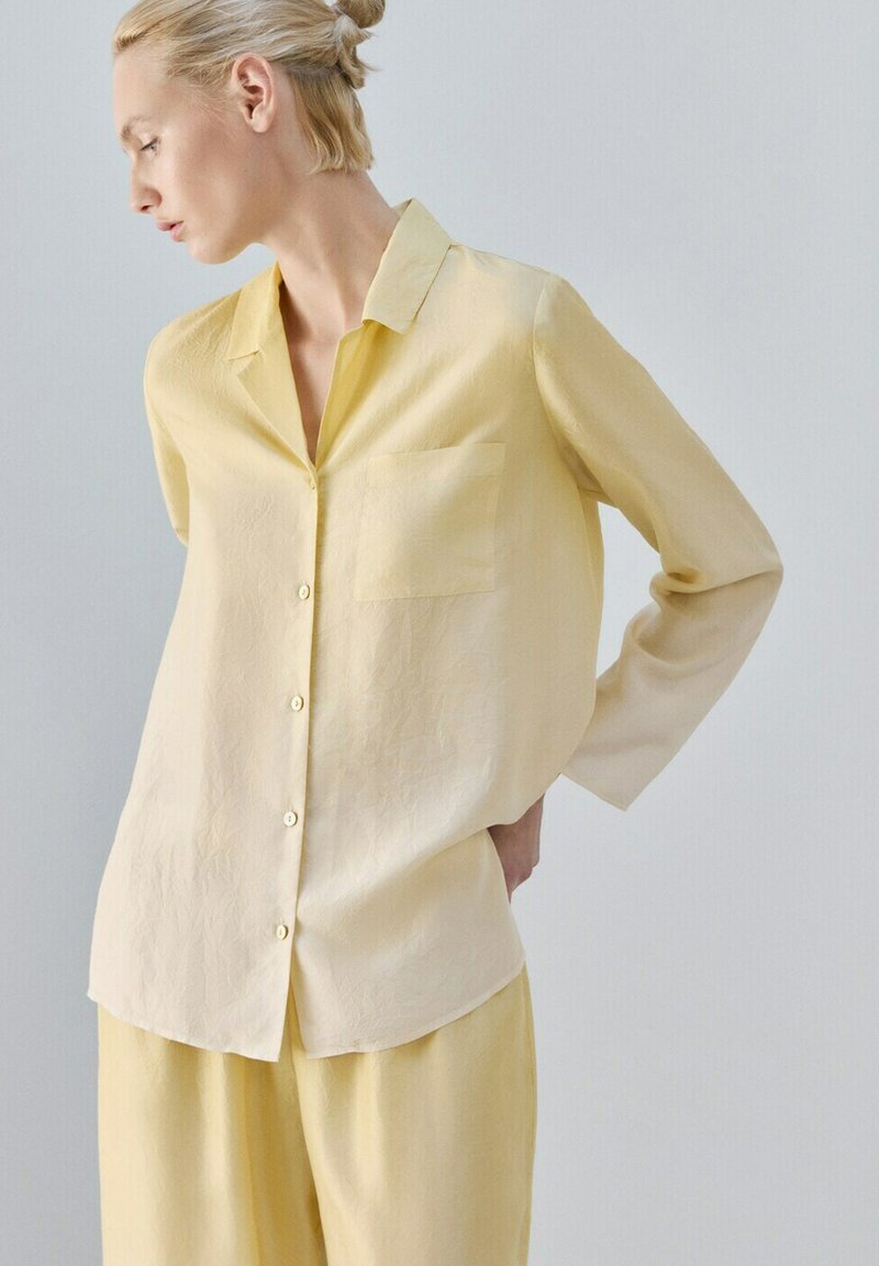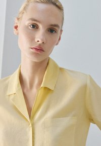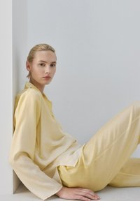 Femme portant une chemise ample boutonnée jaune pâle et un pantalon assorti, regardant vers la gauche avec les cheveux attachés en chignon.