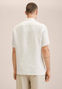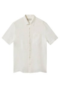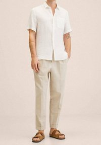 Chemise en lin blanc à manches courtes avec devant boutonné, une poche poitrine unique et une coupe décontractée, associée à un pantalon beige clair.