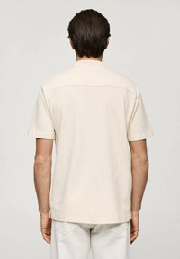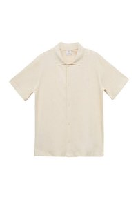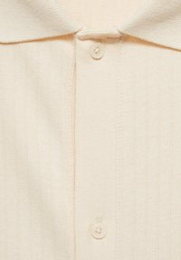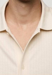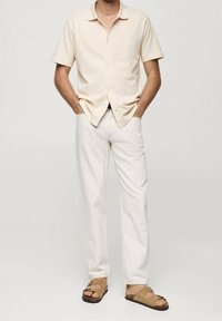 Homme portant une chemise beige à manches courtes boutonnée et un pantalon blanc, la main gauche dans la poche et le bras droit détendu le long du corps.