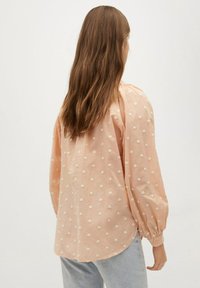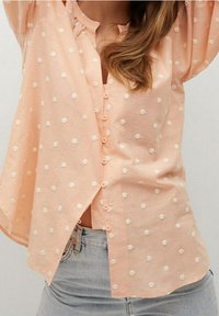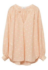 Blouse pêche avec des pois blancs, fermeture à boutons à l'avant, coupe loose et texture de tissu douce. Présente un col arrondi et des manches larges.