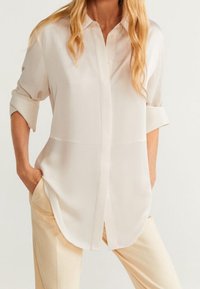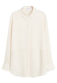 Blouse beige clair avec un col, fermeture boutonnée à l'avant et manches retroussées. Confectionnée en tissu lisse et léger avec une coupe ample.
