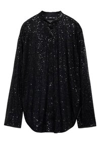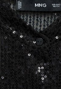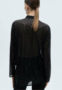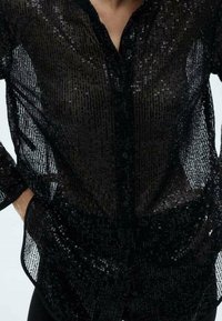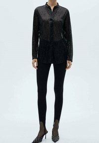 Femme portant une chemise noire transparente à manches longues ornée de sequins, un pantalon noir slim avec des fentes à l'avant, et des talons pointus noirs ornés de clous blancs.