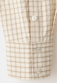 Chemise à manches courtes à rayures verticales beige et blanches, avec col et poche poitrine avant.