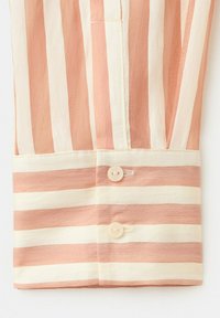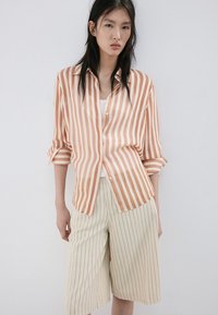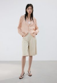 Jeune femme portant une chemise à rayures verticales pêche et blanches avec des manches retroussées et un short crème avec de fines rayures verticales noires.
