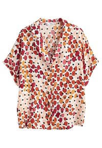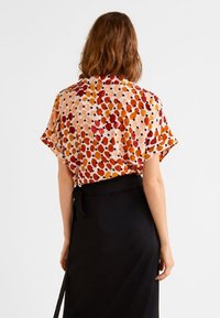 Femme portant un chemisier à manches courtes avec des taches abstraites rouges, orange et noires, rentrée dans une jupe noire taille haute.