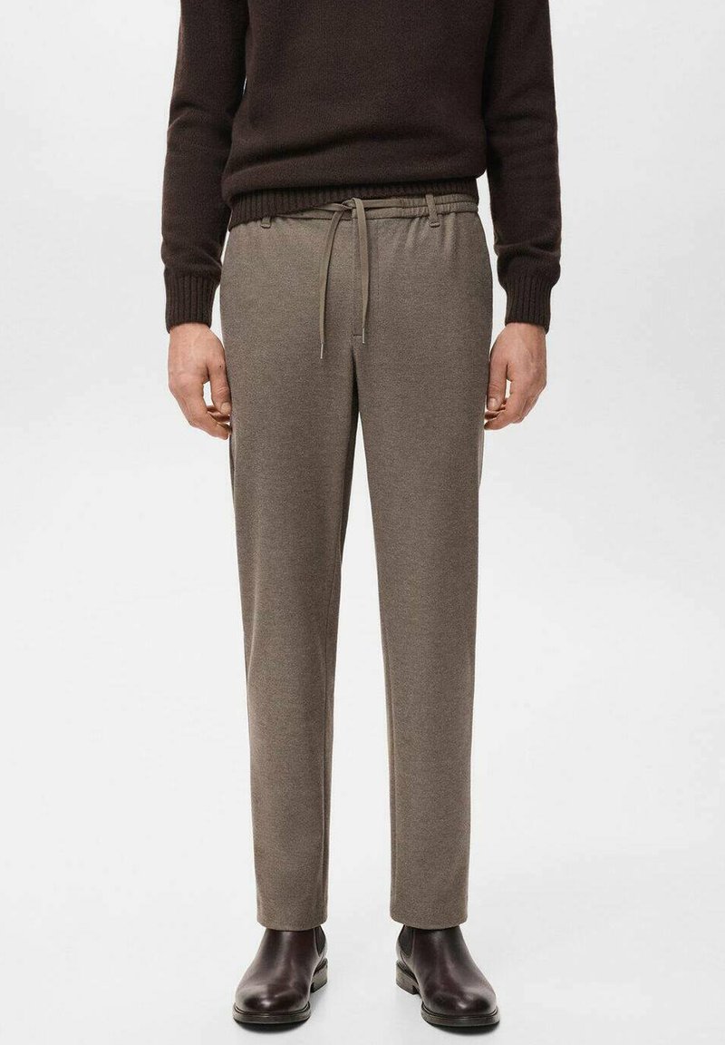 Pantalon marron clair, fuselé, avec une taille élastique et un cordon de serrage. Confectionné dans un tissu doux et texturé, associé à des bottes marron foncé.