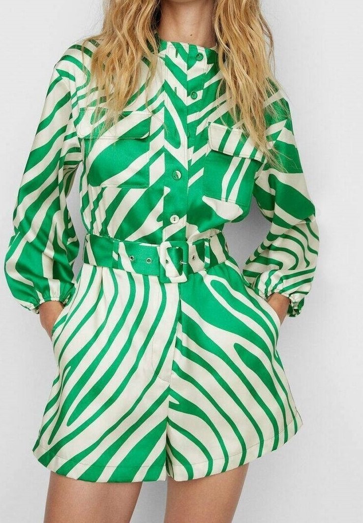 Femme portant une combinaison à rayures vertes et blanches, boutonnée, cintrée à la taille, avec manches longues et poches, les mains dans les poches.