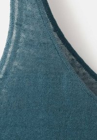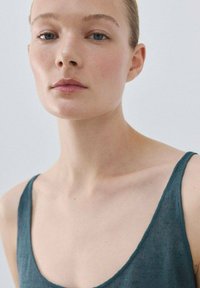 Femme aux cheveux tirés en arrière portant un haut sans manches vert foncé et un pantalon noir, debout devant un fond uni de couleur claire.