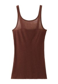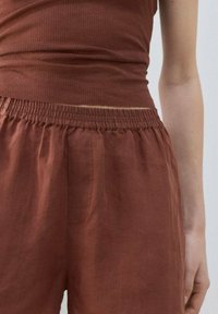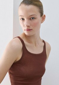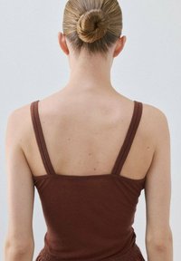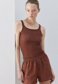 Femme à la peau claire et aux cheveux attachés portant un débardeur marron et un short assorti à taille élastique, sur fond uni.
