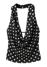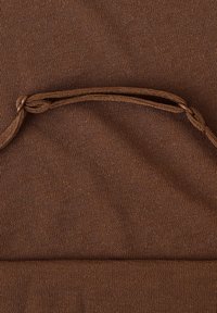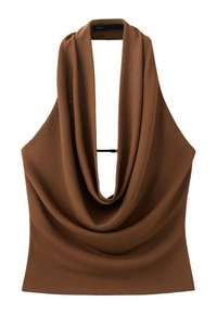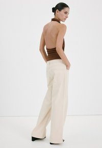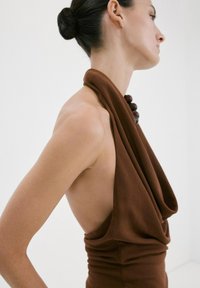 Femme portant un haut marron drapé sans manches à col halter, un pantalon crème et un collier épais de perles en bois foncé, posant avec une main dans la poche.