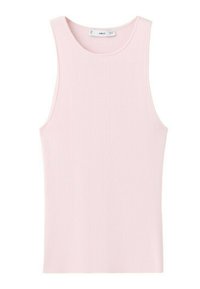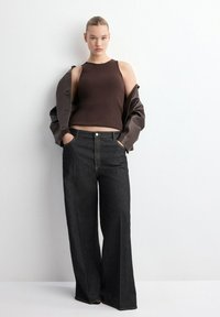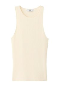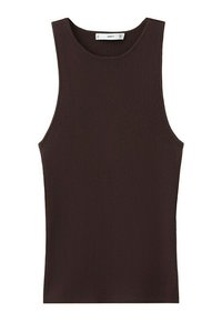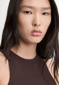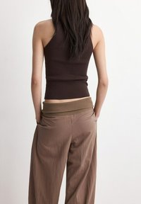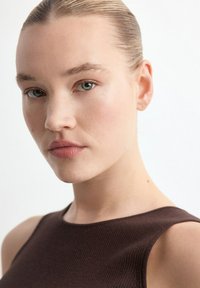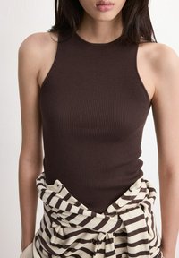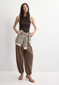 Jeune personne portant un haut côtelé sans manches de couleur brun foncé et une chemise beige et marron à rayures manches longues nouée autour de la taille.