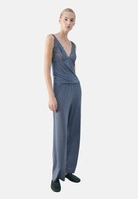 Femme debout portant un haut sans manches bleu orné de dentelle et un pantalon ample assorti avec des chaussures noires faciles à enfiler, sur un fond blanc.