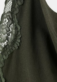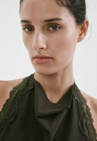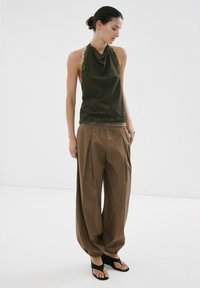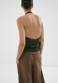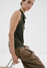 Femme portant un haut dos nu vert foncé orné de dentelle, un pantalon plissé marron ample et des sandales noires, debout devant un fond blanc.