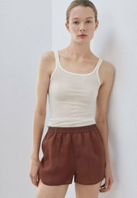 Jeune femme debout contre un mur blanc, portant un débardeur blanc sans manches et un short marron ample, regardant droit devant avec une expression neutre.