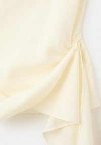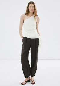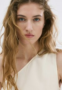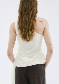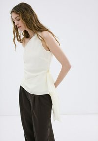 Femme aux longs cheveux portant un haut blanc sans manches asymétrique et un pantalon noir ample, debout devant un fond blanc uni.