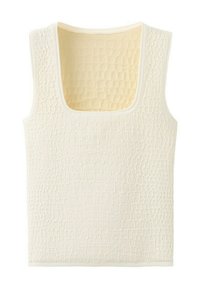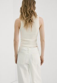 • Femme portant un haut blanc à côtes sans manches et un jean bleu, les mains dans les poches, debout devant un fond clair uni.