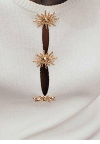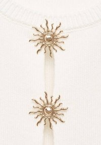 Débardeur en tricot blanc sans manches avec trois accents en fleurs dorées près de l'encolure et un petit détail en découpe. Texture lisse et design ajusté.