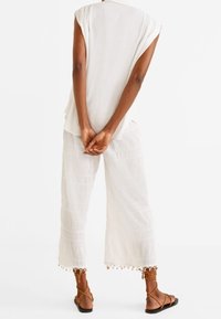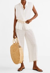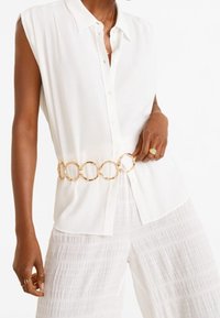 Blouse blanche sans manches avec boutons sur le devant, associée à un pantalon large texturé blanc. Ceinture chaîne en or ajoutant un détail contrastant.