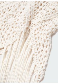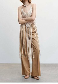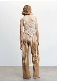 Haut blanc sans manches en crochet avec des motifs ajourés porté par une personne avec un collier de coquillages orné d'un pendentif violet poli.